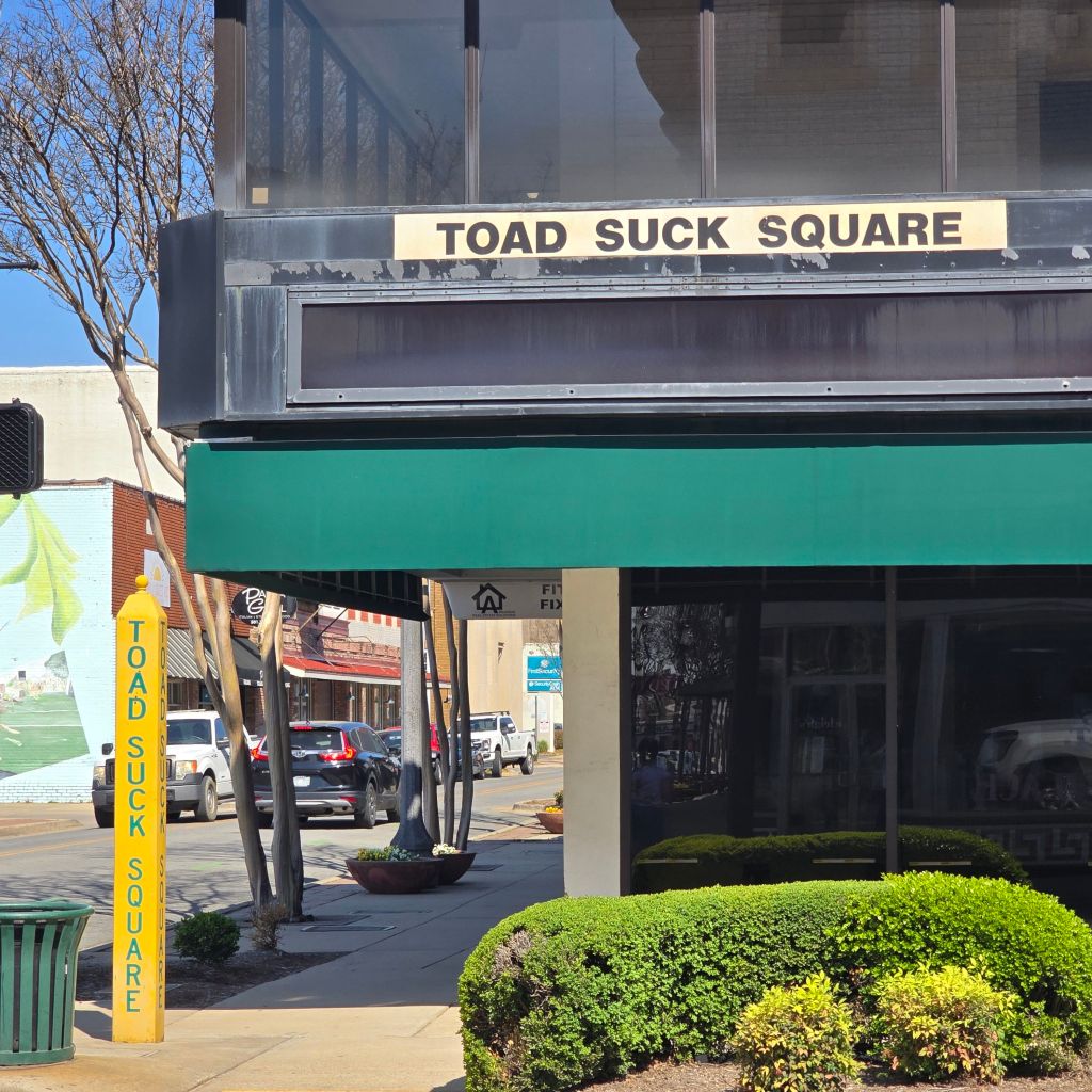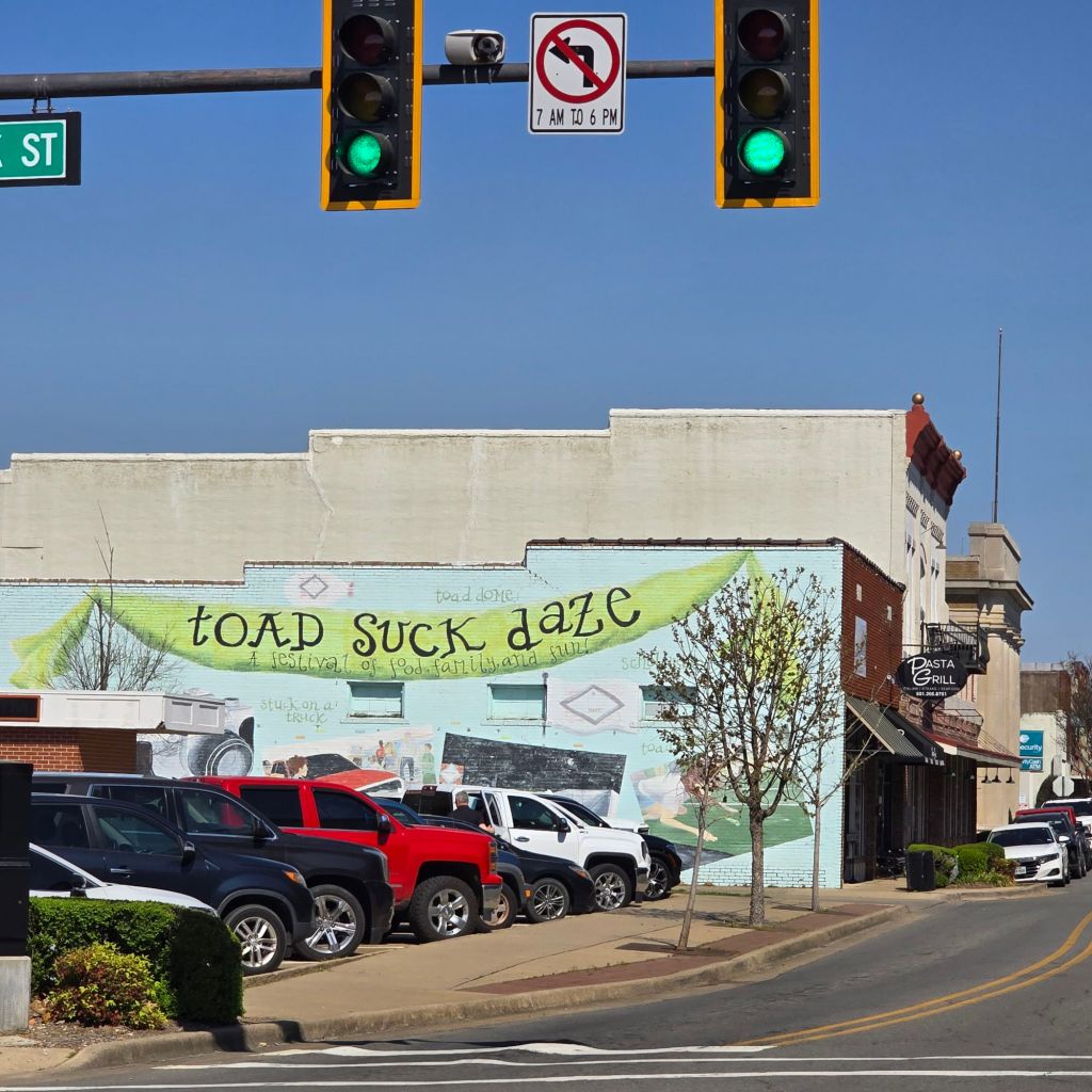 We walked through old town Conway and happened onto the Toad Suck Square. Another local asked if we were visitors and then proceeded to explain the Toad Suck festival and it’s history. Toad Suck is actually a town on the river near Conway. Turns out, a section of river that gets narrow and shallow is referred to as a suck and such an area was just down river from Conway where the ferry used to run. This area began having an annual festival which became known as the Toad Suck Festivial.. In 1990, because of flooding at the original location, the festival was moved to Conway where it has remained. It is a huge event which draws many vendors and fills the old town area for the week. If you are near Conway in early May, check it out.