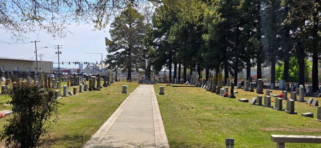 We began at St Joseph Catholic Church for daily Mass. St Joseph Parish in Conway is actually a large campus of buildings which includes the church, cemetery, grade school, middle school, and high school all co-located. The church is beautiful and has had continuous, 24 hour Eucharistic adoration for the past 30 years. Throughout the day everyone we met, even on the street, were exceptionally friendly and went out of their way to help us. After leaving Mass we met a parishioner, Carol Hambuchen, and asked where the parish office was located, only to learn that this week the office was closed due to Spring Break. After explaining the purpose of our visit and desire to locate David Anthony’s burial site, Carol escorted us to the cemetery and made some calls to get the name of the person who manages burial plots. She then directed us to a building across the train tracks which I presume to be the parish office but in reality was an endowment office for St Joseph’s School. She said there may be someone there, if we see a car, and they might be able help. Sure enough, there was a car so we checked it out. Here we met Jacqueline. Although she was not knowledgable about the cemetery plots, she made some calls and took my number to get back to me. She did have considerable knowledge of the history of St Joseph’s and had been a life-long parishioner. She gave us a history summary and showed us pictures from the 1950s when Conway was still very rural. Unfortunately, the man she called informed us there was no listing of David Anthony in his records. There are, however, many unmarked gravesites that had recently been confirmed to hold remains but have long since lost their markers.